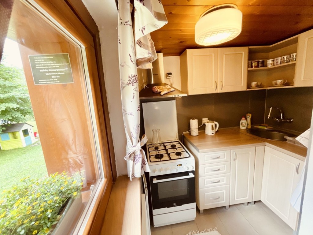 Vkusne zariadená kuchynka, plynový sporák s elektrickou rúrou, veľká chladnička s mrazničkou, mikrovlná rúra, varná kanvica, kávovar na rôzne kapsule, či mletú kávu k príprave chutného espressa, bohato zariadený detský kútik.